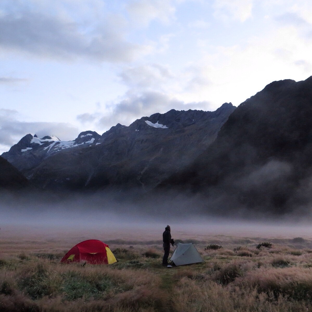 Already on the road the majestic scenery started unfolding itself. Sharp peaks and big glaciers stood out on the western side of Lake Wakatipu. On the first part of the Routeburn we walked through a mighty forest, with tall beech trees towering over a canopy of large ferns on the forest floor. We only had 6,5km to cover that day and took all the time in the world. As we reached our campsite at Routeburn Flats the landscape opened up and we pitched our tent on the most dramati spot yet, in direct view of Mount Xenibus and its icy slopes.