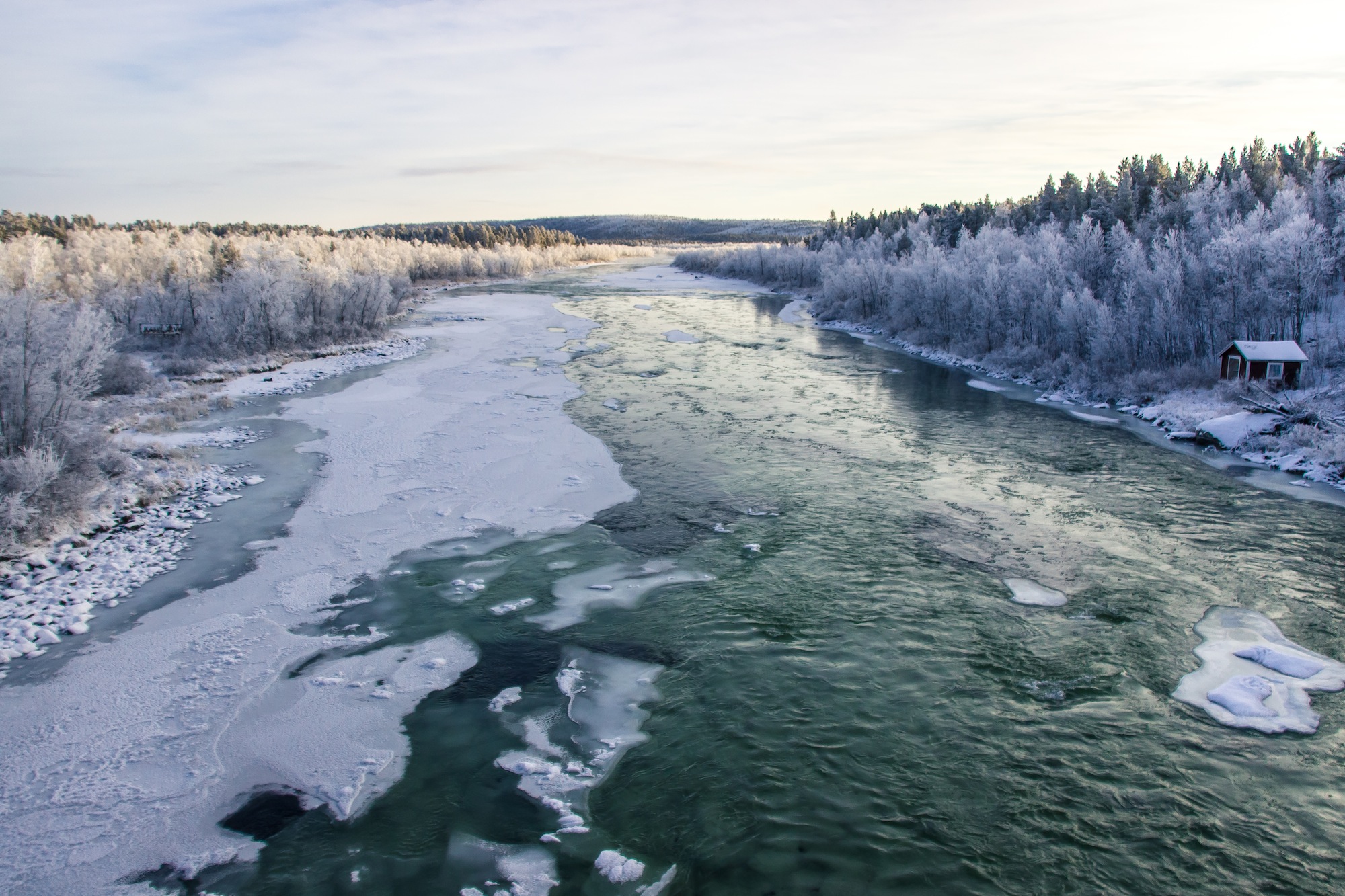 In spite of the lack of snow Kiruna has shown its best sides as of late. With a lot of cold but clear weather we can see Sweden’s highest mountains shining in the distance when we are training the dogs on the road. Every afternoon the Kebnekaise massif glows red when the last of the sun hits the snow. Every time we drive to town we see them in our rearview mirror until they disappear behind the mine. Every trip we make to Jukkasjärvi we are reminded of the power of the Torne river, with white glowing mountains further upstream, flowing until recently but now mostly frozen and glowing white. The moving ice under the bridges makes for beautiful, colorful spectacles while little waterfalls make their way over submerged ice plates. Actually, I really like this place.