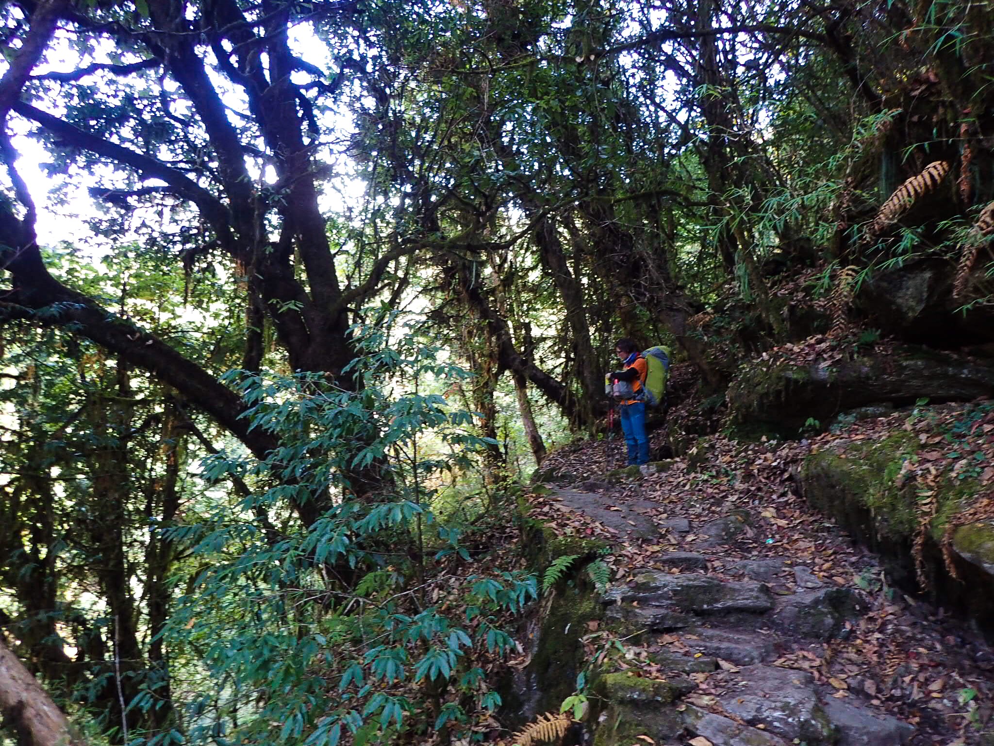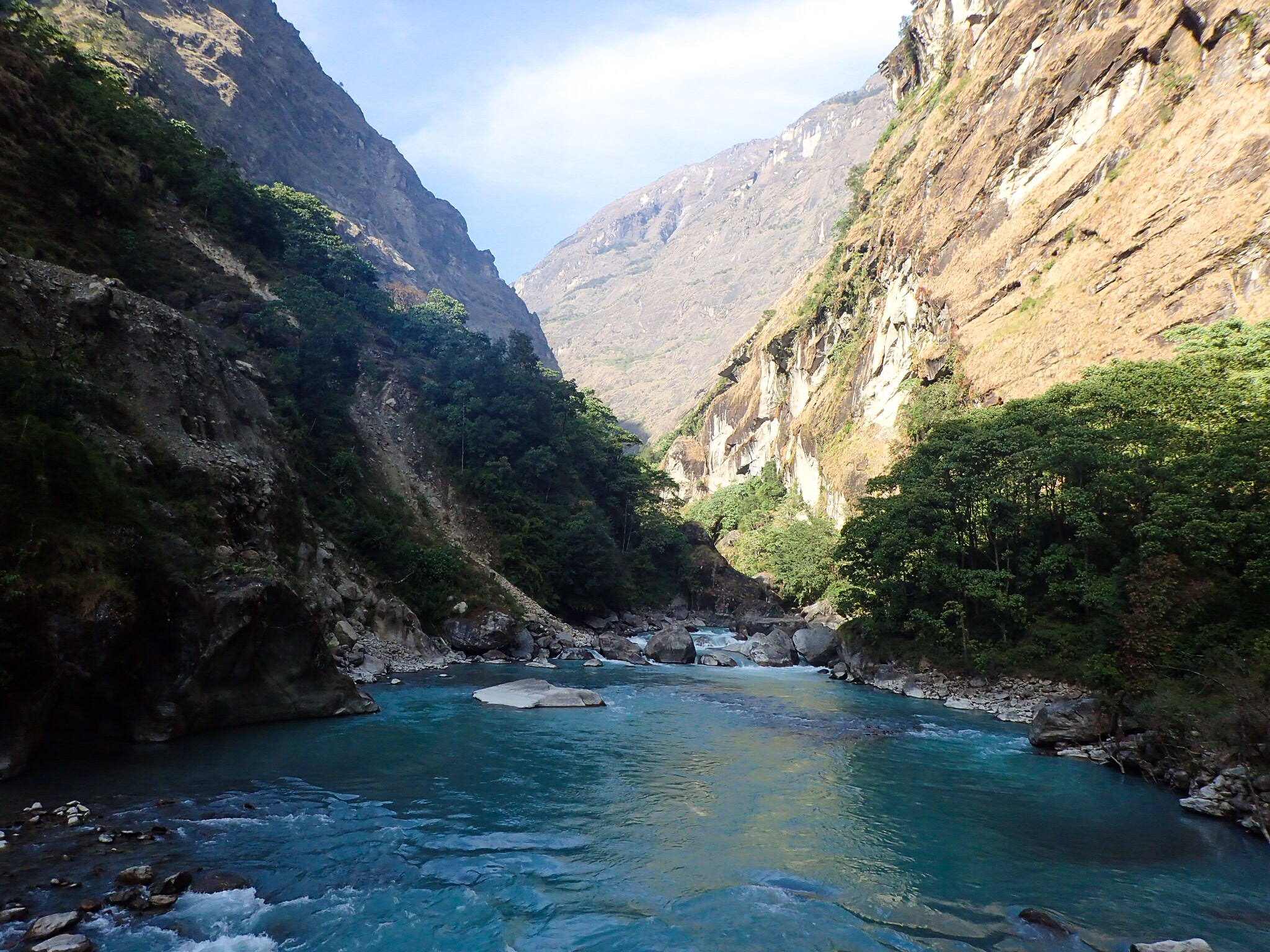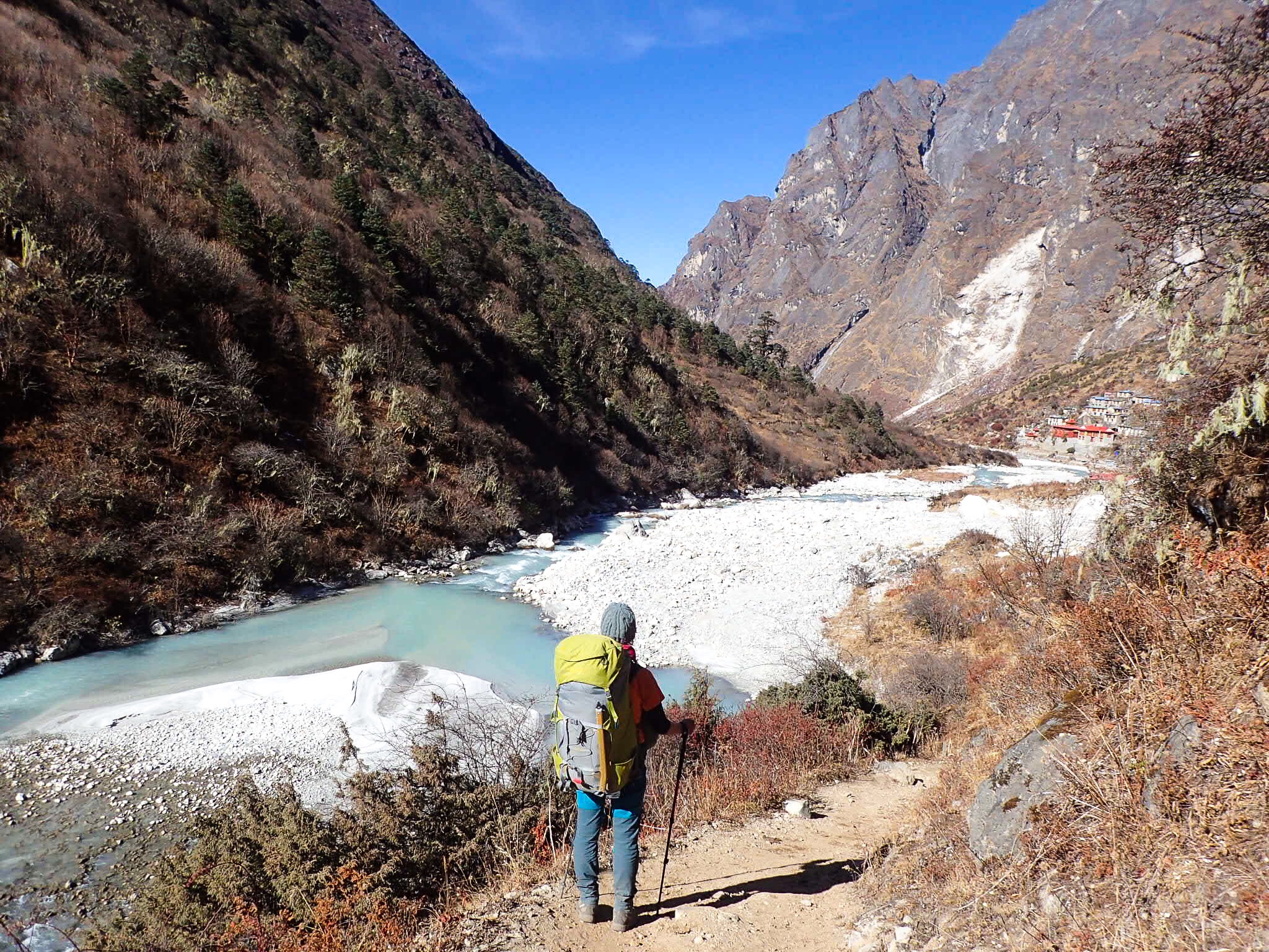 The eastern part of the hike was very much worth it. The forest became greener and greener as we went down. Deciduous trees appeared, their leaves had started colouring brown and fell to the ground. The river that ran through the valley had a colour so bright blue that it was almost surreal: we frequently stopped to look at it, it was as if we were walking in a cartoon with exaggerated colours. The air became warmer fast and it didn’t take long until we were without jackets. A cosy little teahouse was our shelter for the night, dropping below 3000m for the first time in over 20 days.