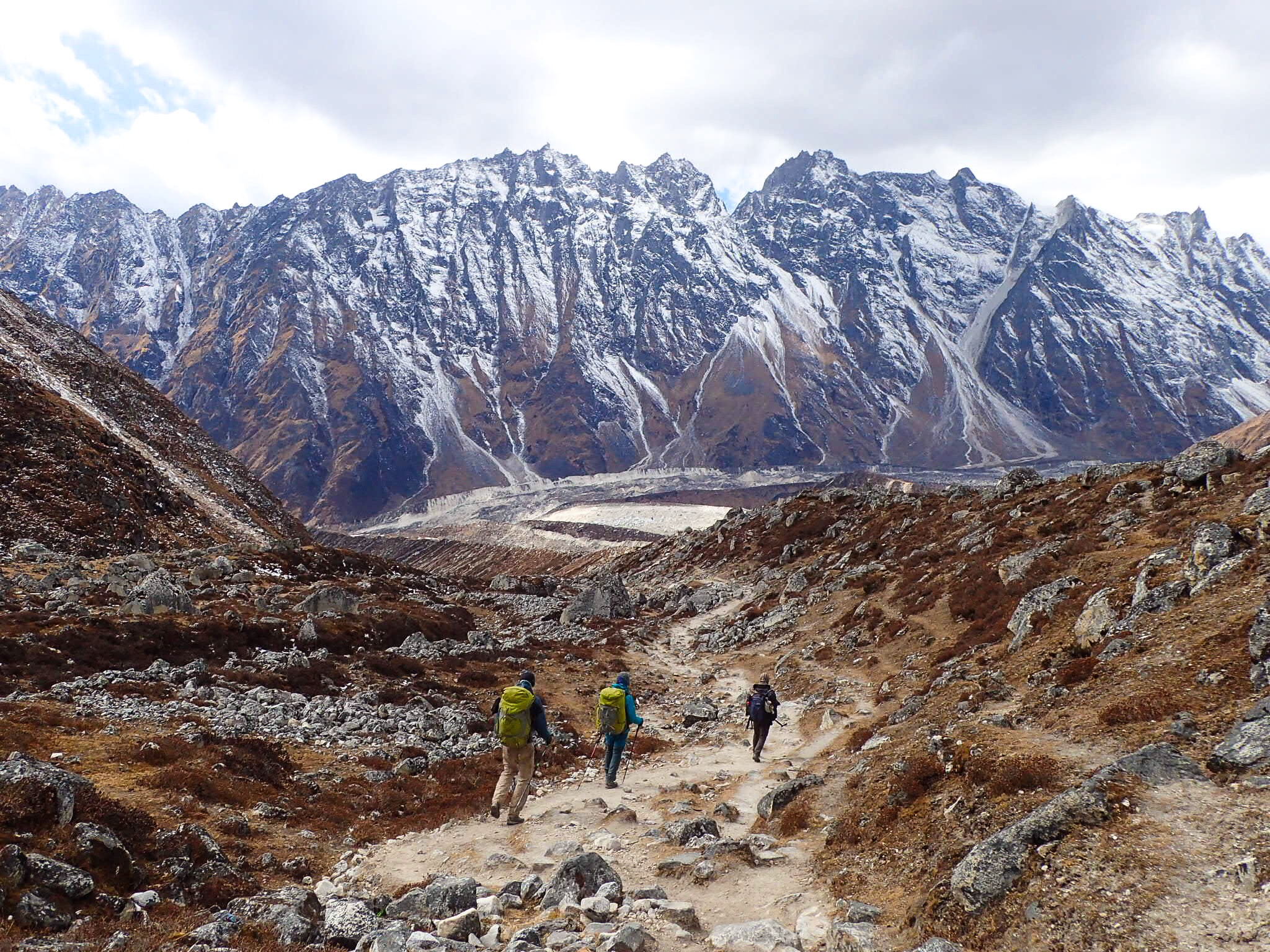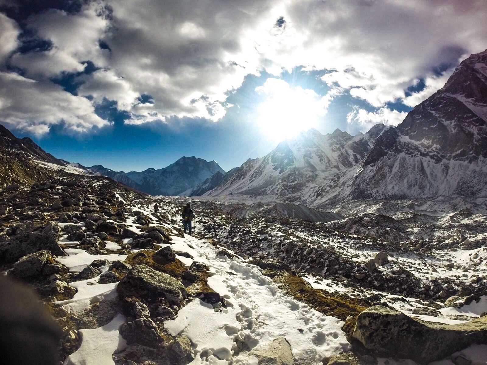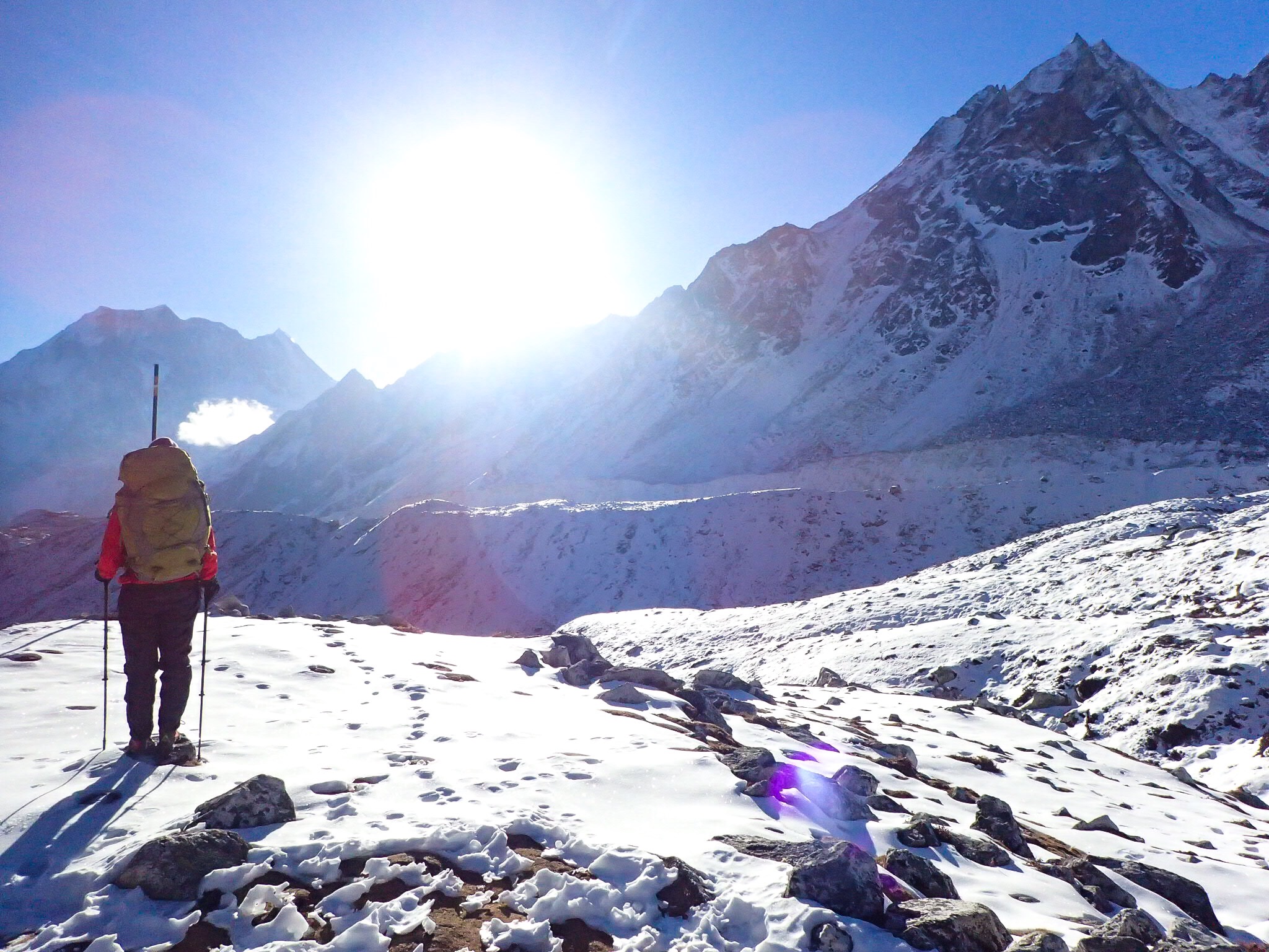 Already higher up the mountain we negotiated with BJ for a post-dawn start. The morning light was stunning, but the air was icy. About 2 hours after we started clouds began to roll over the pass, the first signs of the storm that had been predicted for later that day. Without the sun and with a fierce, howling wind temperatures dropped far below -10C. We hadn’t ventured above 5000m since Tashi Labsta in the first half of November, something I felt hard after we got on the moraine at 4900m. The cold and altitude illness combined made me 100% miserable up there: I just wanted to get down. I tried to appreciate the view: the walls of the Manaslu massif, the glaciers, the hanging ice. But it wasn’t until we got a good ways down and the jagged peaks of the Kechakyu Himal pierced to wards the sky that I started to have a good time.