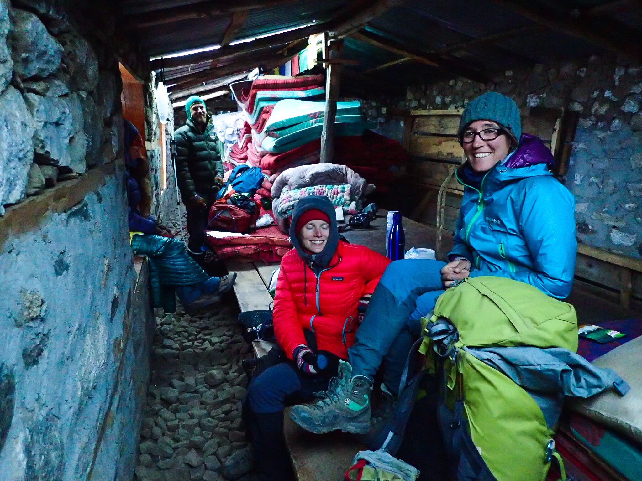 There is no stove at Dharamsala: it was bitter cold. We shared a large sleeping space with the 3 guys and two Czech, who kept Agaman out of his sleep all night by first continuously tapping him as soon as he snored a bit and then snoring really loud themselves. As soon as we settled in everyone crawled into their sleeping bags for comfort. The guides brought us all dal bhat in bed, which was really kind. We had a pretty cosy night up there in our sleeping hall. The guides did not: the one, small blanket they were given bought them little protection against the cold.
