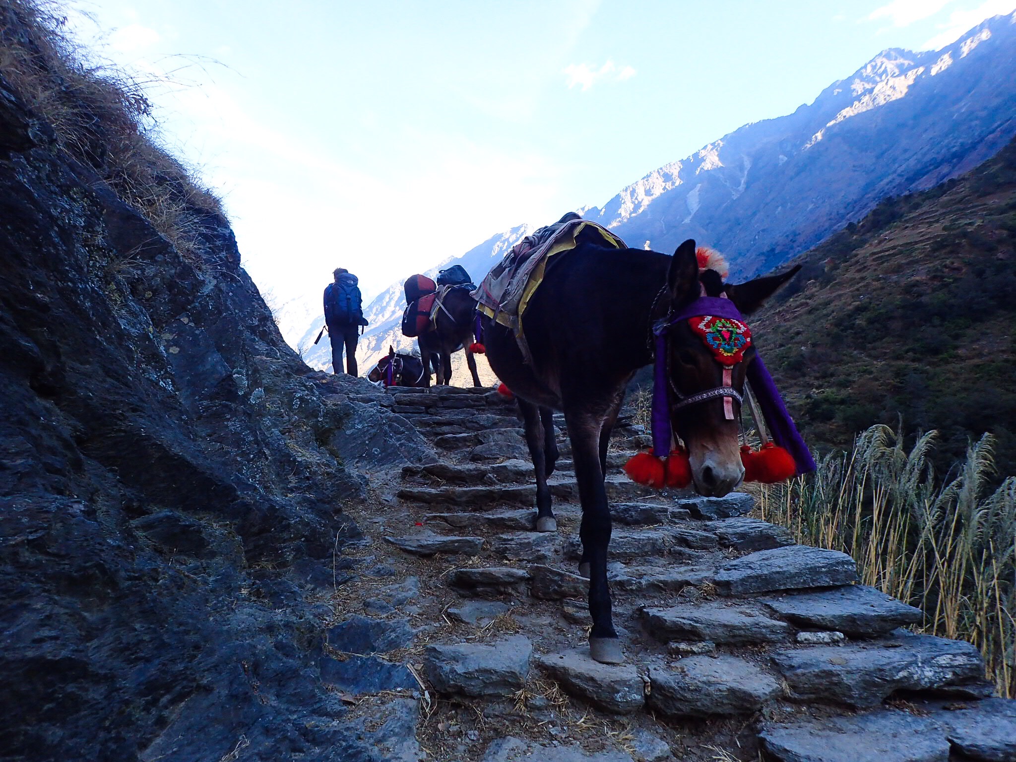 I was glad to be here now. Manaslu was a section I had been looking forward to for a long time and it did not fail to deliver on any part. The views were some of the best we’ve had, the crowds were gone in the face of winter, the people kind and helpful and the food was amazing with more fresh vegetables than anywhere else. We came upon some wildlife along the way: monkeys, eagles, Himalayan martens, griffins and even a herd of blue sheep.