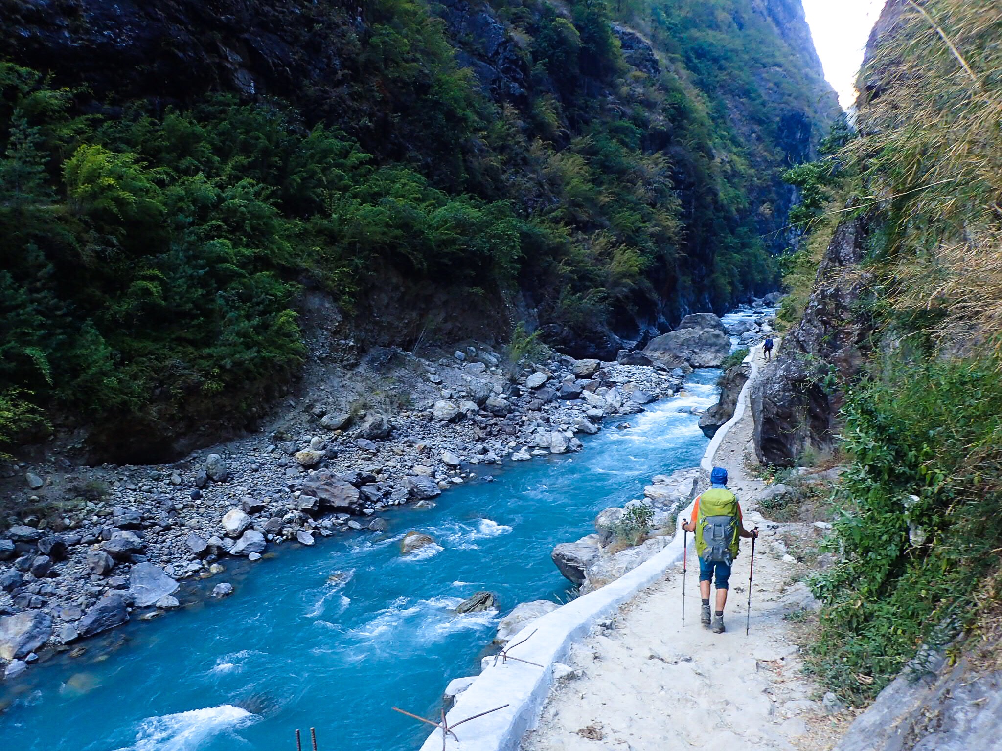 The circuit follows the valley of the Budhi Gandahki right to its origins at the glaciers surrounding Larkye La, a high pass at 5135m. During the first 3 days of the trek the river valley was deep and surrounded by sheer cliffs over which waterfalls tumbled their way down. The roaring turquoise river cascaded down over high-walled canyons and through dense forests. The mountains hid behind the walls, yet the walk was stunning all the same.