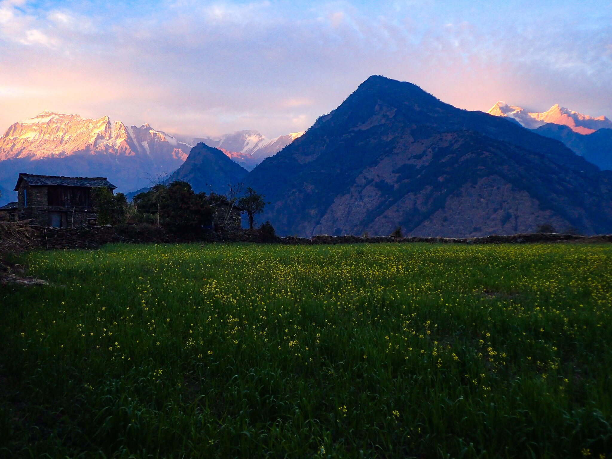 All day long, the views over Dhaulagiri were stunning. Dhaulagiri one stood mighty and alone, while the rest of the range spiked along the horizon. Dhaulagiri would be the last 8000er we passed along the way. On New Year’s Eve we arrived in Dharapani and came upon a little guest house there. It was a basic, but cozy little place. The fall in prices was accompanied by the disappearance of mattresses, pillows and menus. It did not matter. They served amazing dal bhat in that place, accompanied by a pumpkin stew. The view from there was priceless: when the sun set a final time in 2017 the sky and the Dhaulagiris alike turned into vivid oranges and pinks, contrasting starkly with the green grass and yellow flowers in the field behind the house.