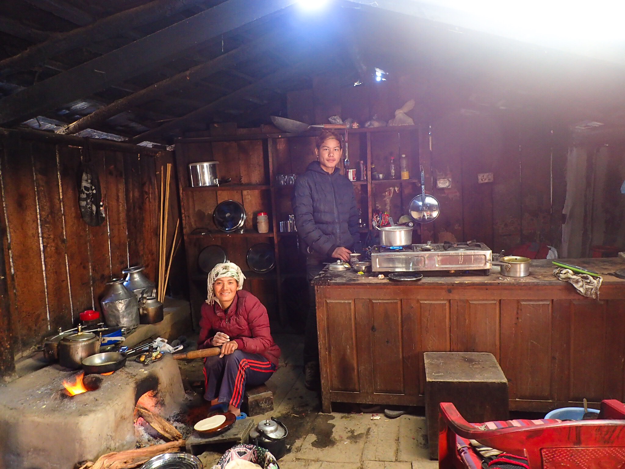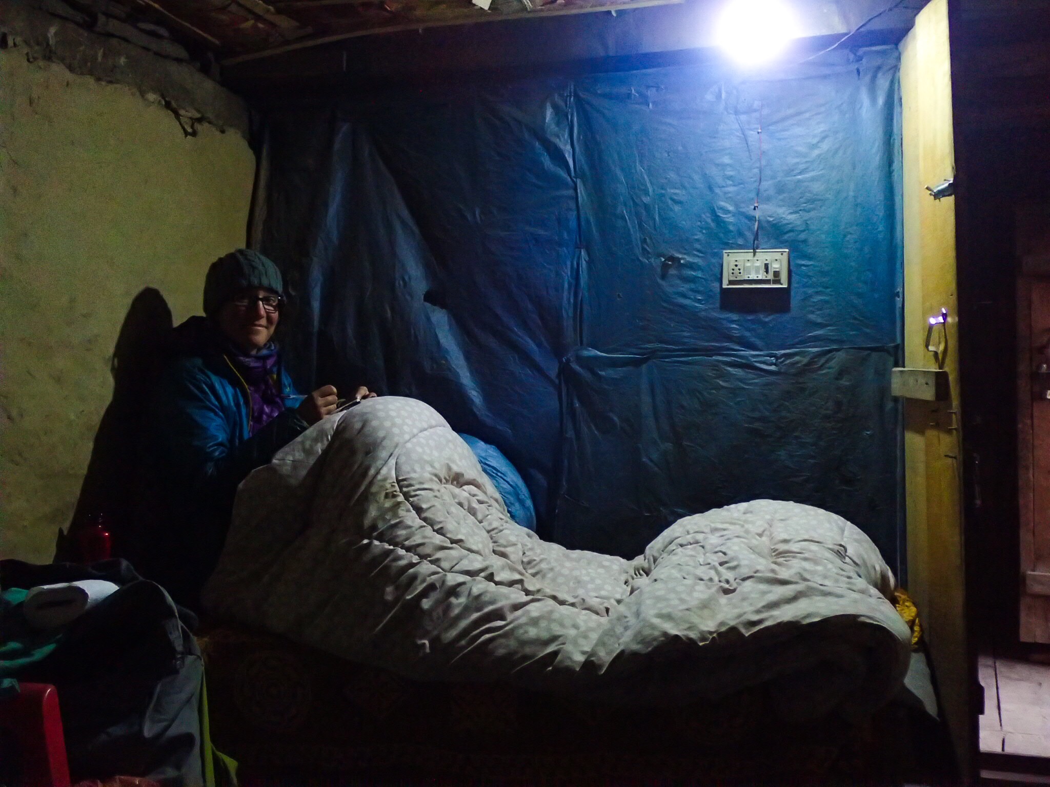 The people who owned that little hotel were so sweet, though: they saw us sitting there in our despair and started chatting us up a bit. They had opened the place up especially for us: that lady who found us on the road called them in, so they showed up to make our bed, cook us a great curry for dinner and another for breakfast. They made jokes about the cold, so after a while we could laugh about it too, and laugh at ourselves for being the only 3 people mad enough to be out here trekking right now.