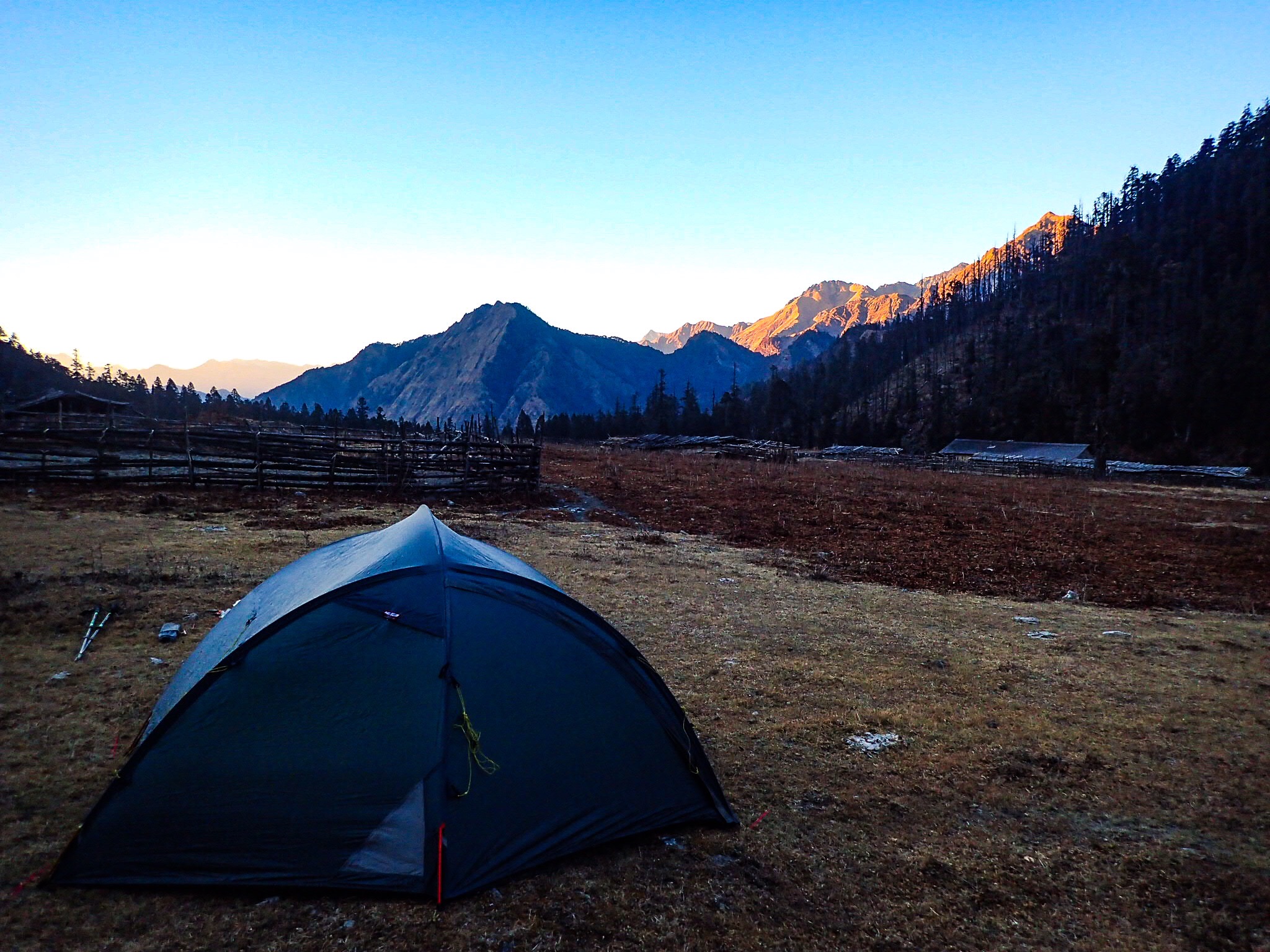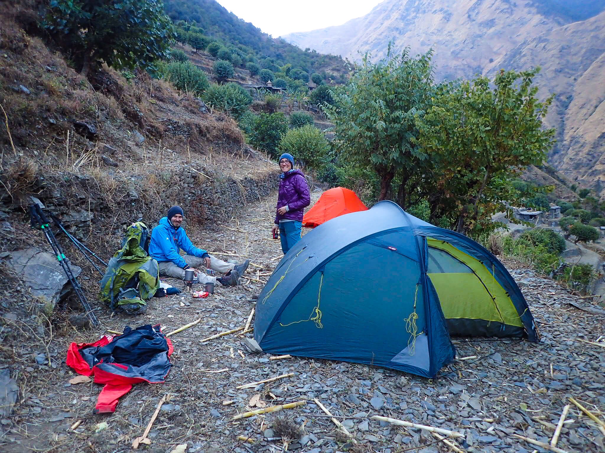 The area was bone dry. The grass was yellow and the fields barren. We learned that the winter rains came fewer and fewer each year, making it impossible to grow winter crops any longer. Besides of the cold, that was another reason why many people left. We did not find any more open homestays and tented the two final nights. It can be a challenge to find flat ground in these steep foothills, so twice we camped in abandoned fields on the edge of winter villages. People only live there for one or two months, while the cold persists higher up.
