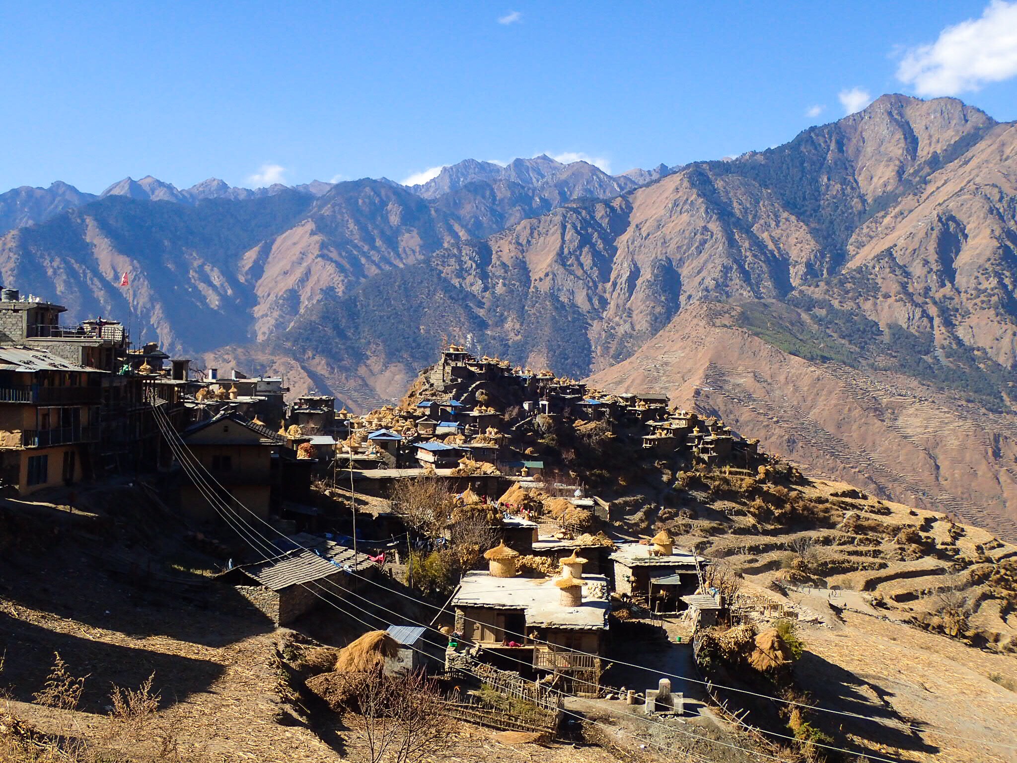 During our first two days of our way out west the going was tough: we made hundreds of meters of undulation several times a day. Against that stood jagged peaks to the north, the Dhaulagiris to the east, and an unknown snowy peak to the west. These mountains: they were so empty, so wild. Villages were tiny up high, and far in between. Everything above the altitude of 2500m had been deserted.