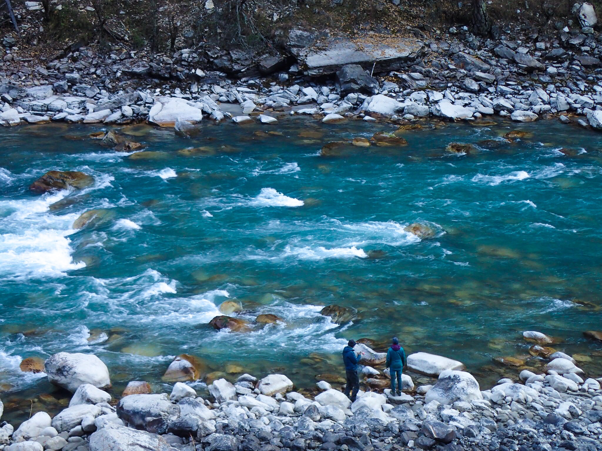 Once we hit the river, things got much better. The high route goes up and over another pass at 4000m, but being in the state we were in and with snow on high elevations we decided to follow the river path down in the valley. In the sunny afternoon we were making our way on a newly built gravel road when a couple of locals called us down to the river, asking if we wanted to eat. These people were so nice that we soon forgot all the bad feelings of the previous days. There were hot springs too: a lot of people were bathing and relaxing, though we never would have noticed if we didn’t go down. After a couple more hours along the river we came across the perfect camping spot. Some people came to have a look and a chat, then went on. Things had a better feel there.