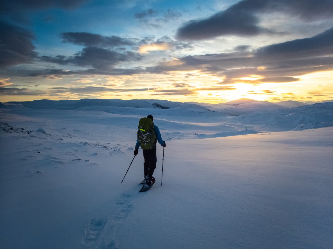 Summer through-hikes are most common, though many winter traverses have already been made. However, to our knowledge no one has ever crossed the country during the autumn and deep of winter, starting in October and continuing through February. That became our goal. In October we stood at Nordkapp and started south on foot. By the beginning of November we added snow shoes to our kit. One month later we put in a small pulka as well to make the long mountain crossing from Abisko to Sulitjelma, so we could transport over 20 days of food with us. We didn’t get far out of Abisko before we had to retreat.